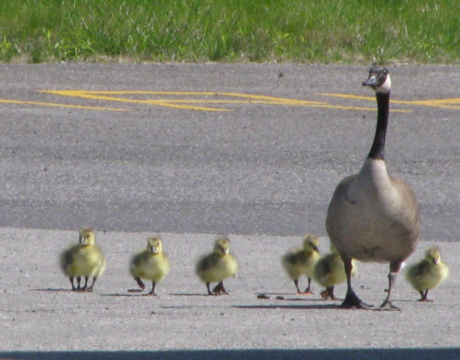 But then as I got into my car, because obviously I still hadn't yet reconciled my bad attitude with my new-found insight, I heaved a big sigh and said, "But God, this isn't what I had in mind for a walk! I wanted something, you know, inspirational, where I would feel in touch with nature, and even find something lovely and photo-worthy!" So I pulled out of the huge parking lot, turned on to the busy industrial street, and something caught my eye. There in the very next parking lot was a family of geese, marching their way from a marshy ditch across the pavement to a grassy lawn in front of one of the neighbouring factories. The mother goose was leading the little ones in a huddling line, the father goose was honking in circles around them, making sure nothing was going to come too close. And since I do work for my own husband, I had the freedom to pull over, stop and get out of my SUV, camera-in-hand, and watch the little goose family for a few precious moments.