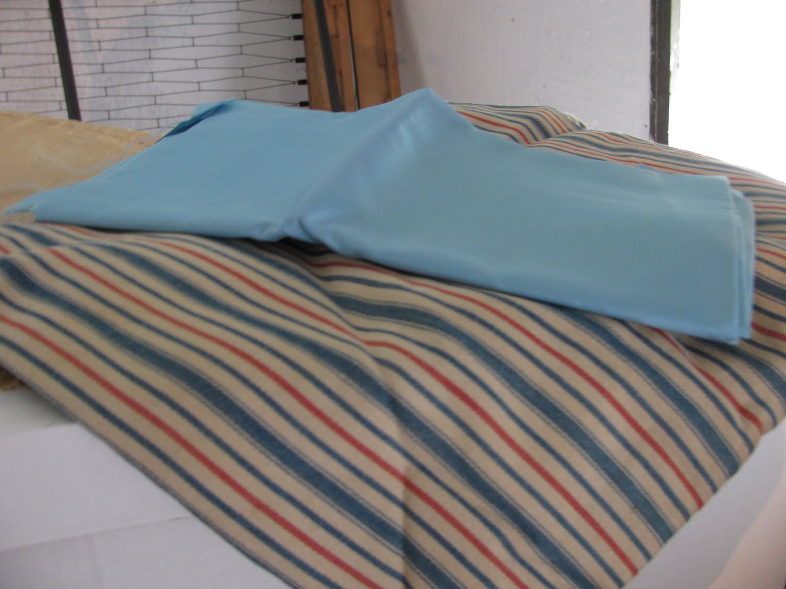 There is an old trunk of my mother-in-law's that I like to open once and while. Today I went up and rummaged around in that trunk hoping to find a remnant of material that might work for a chair I’m making over. I’ve found some different pieces, one of which I think might work: