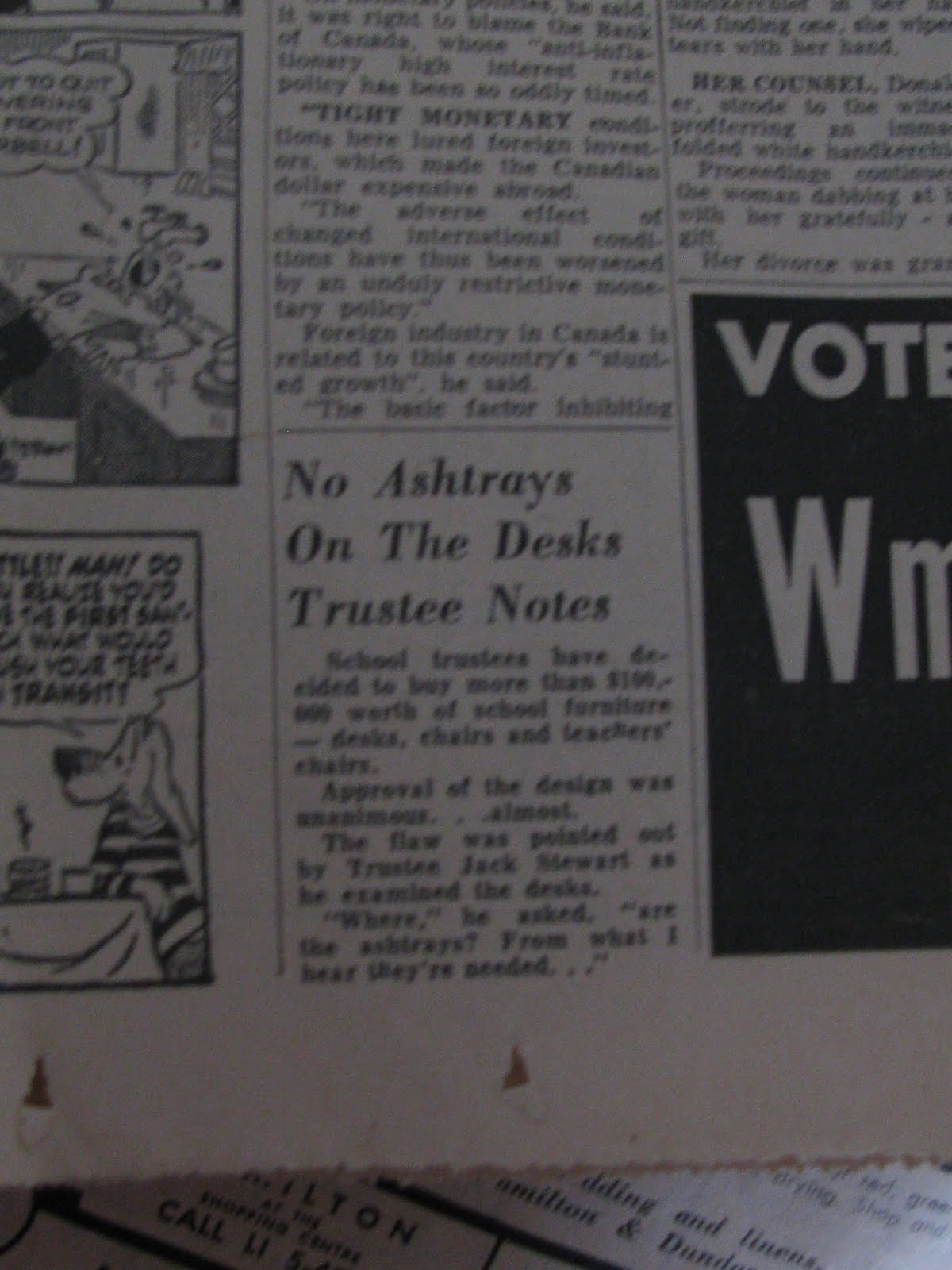 Sorry it's so fuzzy but basically it explains that the school board had almost made the "mistake" of ordering teachers' desks without ashtrays! Fortunately, one of the trustees caught the mistake before the order was placed. Can't imagine teachers ever being allowed to smoke in a classroom, can you? They can't even smoke anywhere near school property now!