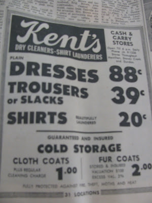 Some of the highlights were in the advertisements, like this one advertising a dry cleaner. Only 88 cents to dry clean a dress or 39 cents for a pair of trousers!